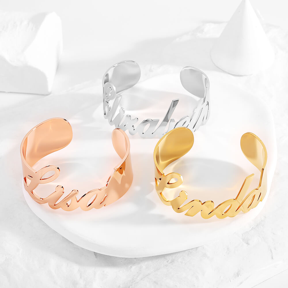 This bangle stands out with its unique design, where your chosen name is intricately crafted as part of the band itself, blending seamlessly into the structure.